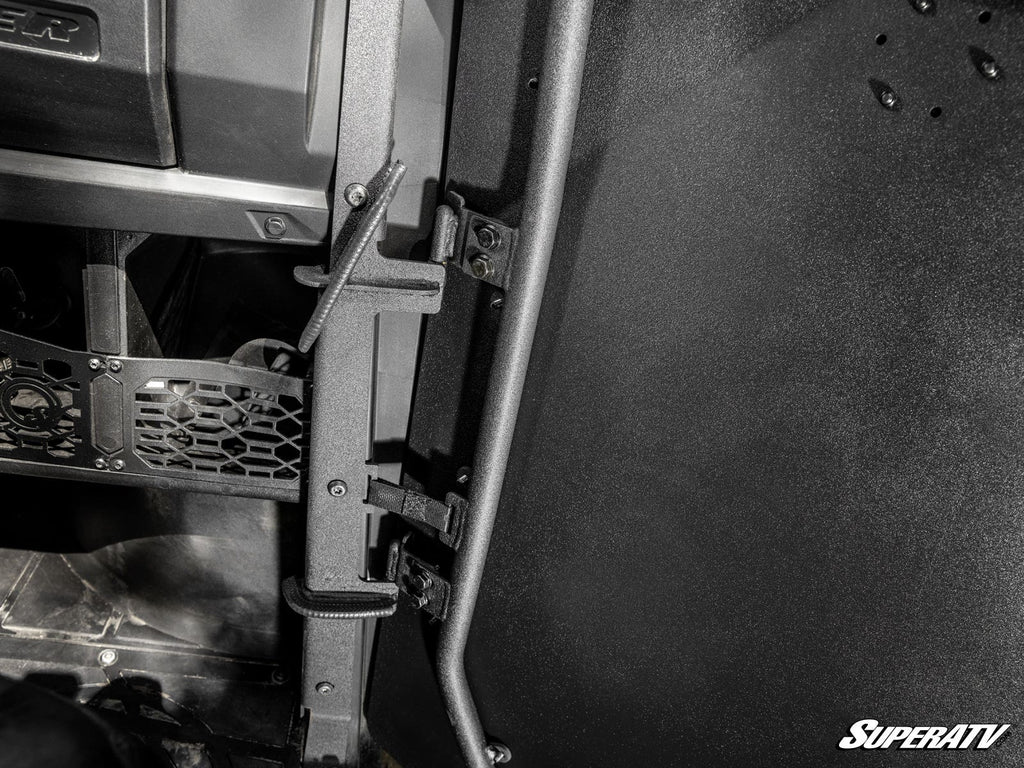 Our aluminum doors come with features to make your ride better. The latching mechanism is placed out of the way, so you won't accidentally bump your knee on it. Plus, the doors are at the perfect height for resting your arms during long rides. Rock crawlers will love that they're easy to remove too—just remove the limiting straps and lift them off the gravity hinges. That makes these doors the best choice for your Polaris Ranger SP 570.