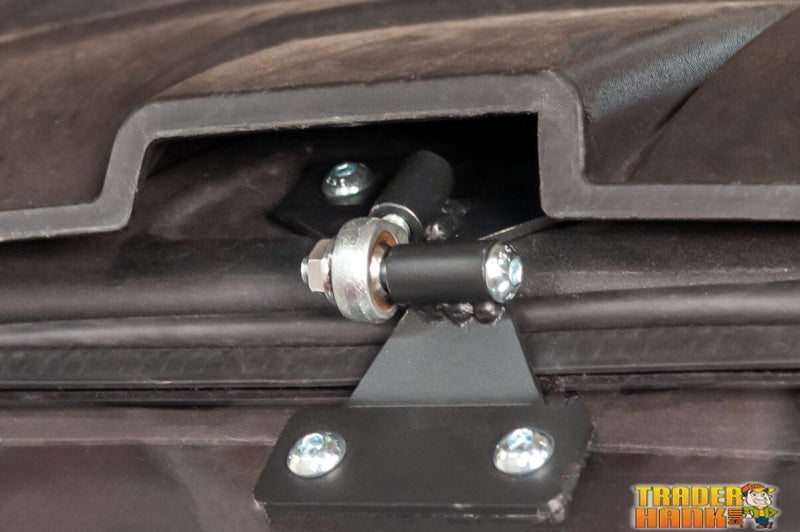 Spherical ball rod ends are utilized as self-aligning hinges along the top of the windshield, allowing for the windshield to pivot freely throughout its range of motion and minimize any binding that may occur. The center retainer and rub plate act as an upper hinge point and helps minimize oscillation when riding with the windshield in the opened position.